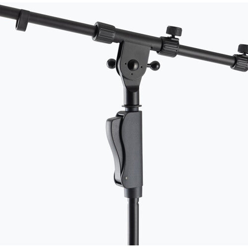The On-Stage MS7550 One-Handed Tripod Microphone Stand with Telescoping Boom features a specialized grip clutch that allows you to adjust the stand height with just one hand. Conveniently located on the upper shaft, this clutch releases when squeezed and automatically locks when released, ensuring quick and easy height adjustments from 46.5 to 72.8". The telescoping mic boom offers flexibility not only in angle and rotation, but also in length from 18.7 to 33.1", allowing you to position the mic for optimal sound while keeping the base clear of performers and instruments.